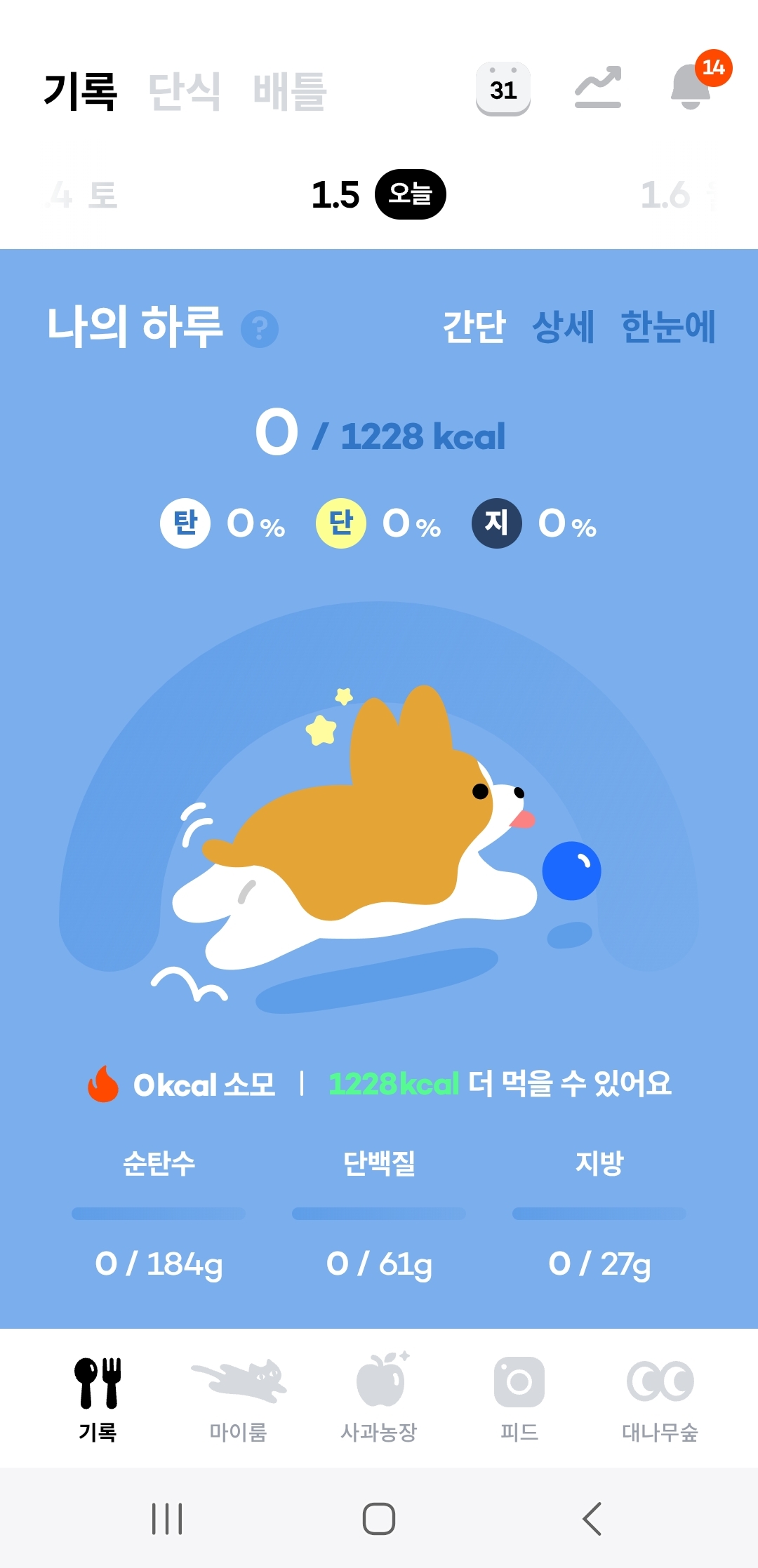 제일 첫 화면에 들어오면 그날 하루에 있었던 식사량이나 영양소별 충족량을