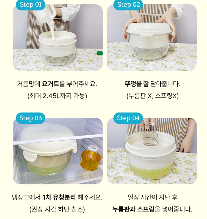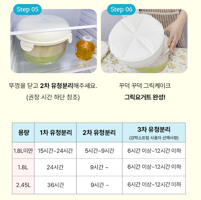 플레인 요거트 최대 2.45L를 한 번에 처리할 수 있어, 800-900g의 그릭요거트를 만들 수 있다.