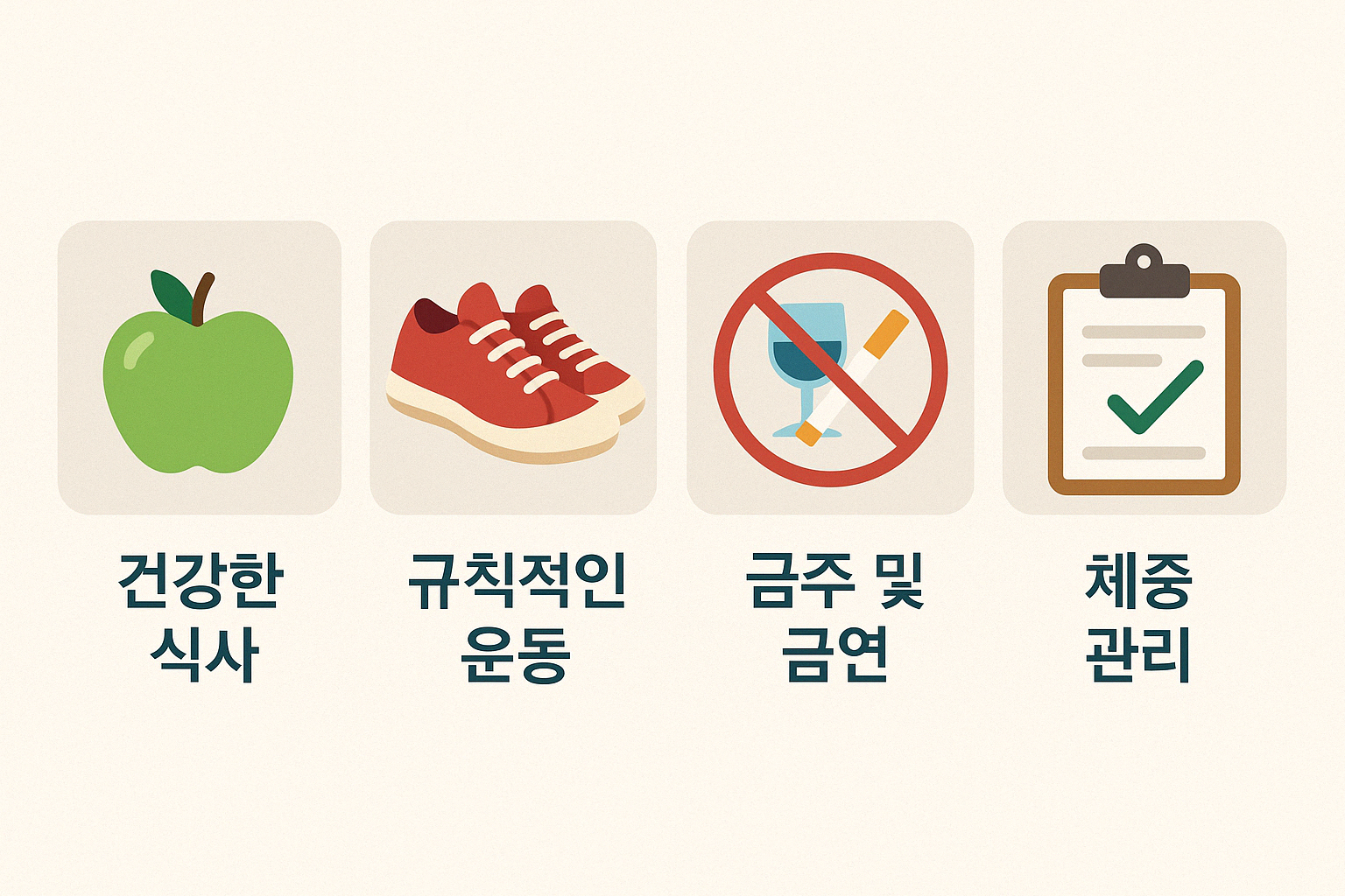 | 의료적 조치 | ● 필요 시 약물치료 고려 | 스타틴 계열 약물 (고위험군 대상, 의사 상담 필요) |